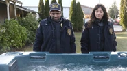 The team receives a 911 call on a bear in a hot tub; Frank questions his night with Dolores.